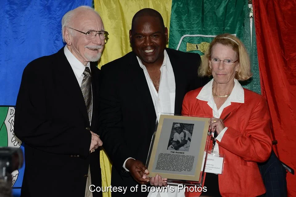 Tim Raines being presented with his plaque at his Canadian Baseball Hall of Fame induction ceremony in St. Marys, Ont., in 2014 by Jim Fanning (left) and Hall board chair Mike King (right). Photo Credit: Brown's Photos/Canadian Baseball Hall of Fame