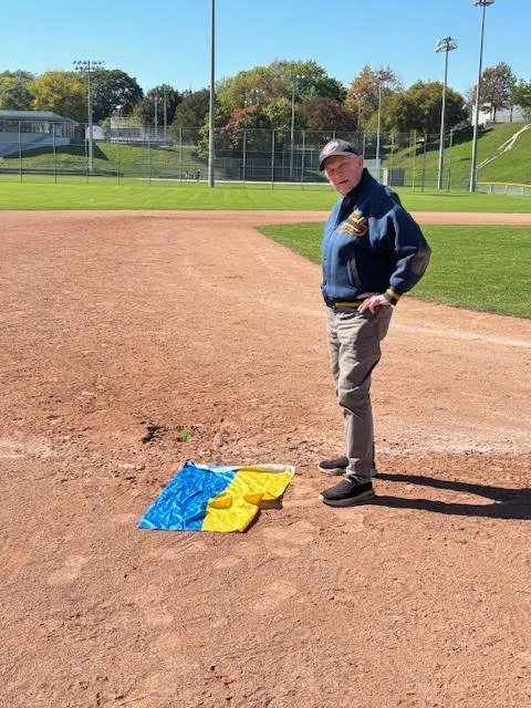 Ted Schmidt, dear friend of the late Joe Sawchuk, stands at third base at Christie Pitts alongside a Ukrainan flag to honour Sawchuk’s heritage,