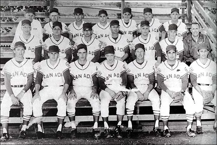 Gerry MacKay (first on left in front row) was the head coach of the national team that competed in the 1967 Pan Am Games in Winnipeg (shown here). This was the first national team to compete in the Pan Am Games. Photo: Baseball Canada