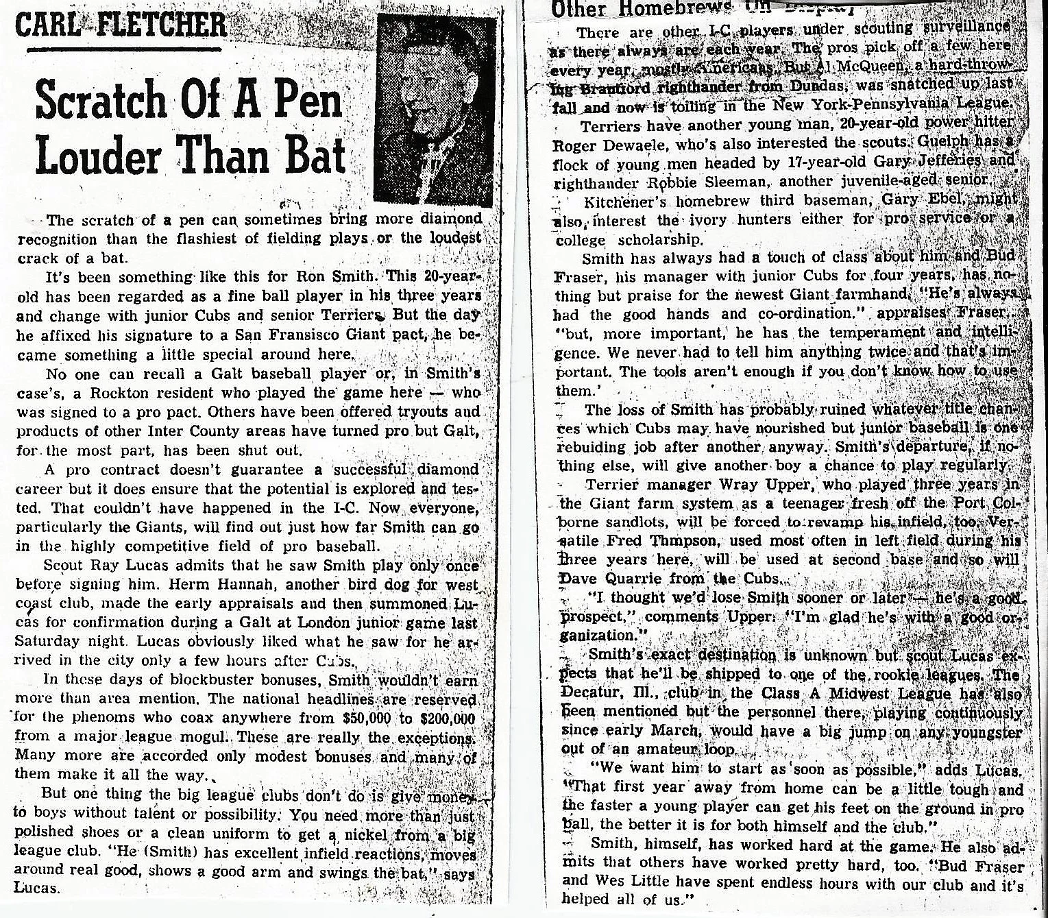 Galt newspaper scribe Carl Fletcher talked about Smith in glowing terms at a time when a player from small-town Ontario signed by a major-league team was a rare occurrence.
