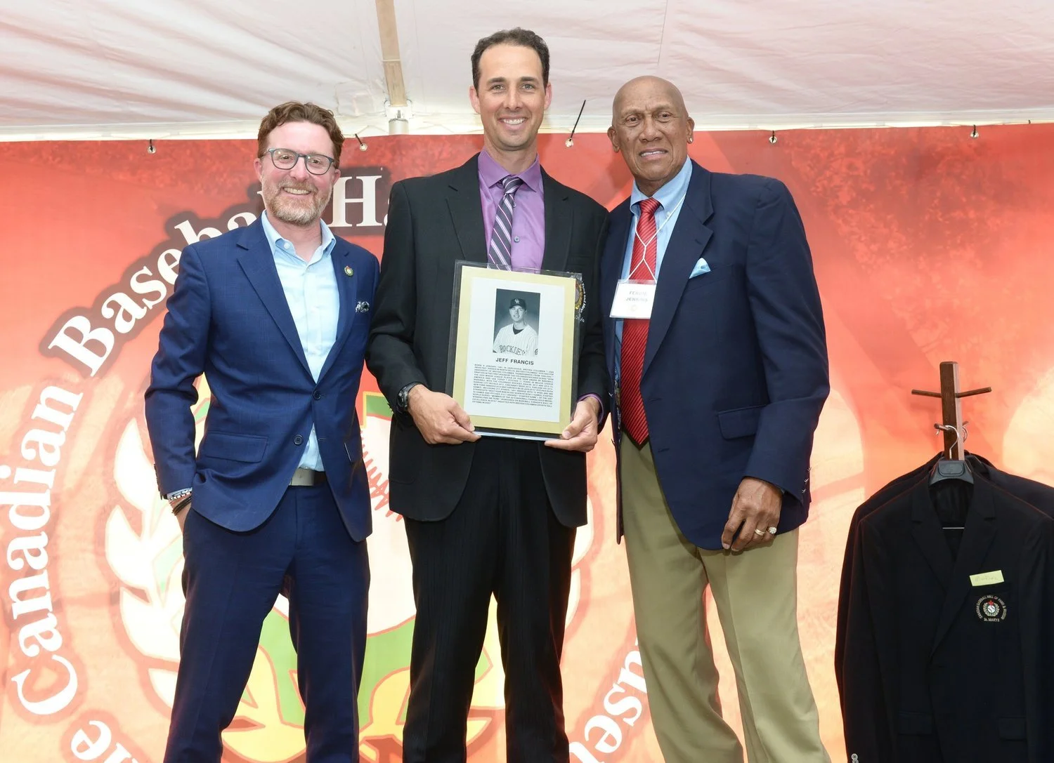 Fergie Jenkins (far right) after presenting former Colorado Rockies ace Jeff Francis (North Delta, B.C.) with his Canadian Baseball Hall of Fame jacket in St. Marys, Ont. Canadian ball hall board chair Jeremy Diamond is on the left. Photo: Canadian Baseball Hall of Fame