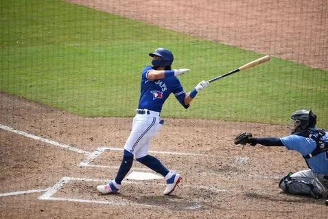 Shortstop Bo Bichette batted leadoff and scored a run for the Toronto Blue Jays in their 8-3 win over the Tampa Bay Rays at TD Ballpark in Dunedin, Fla., on Monday afternoon. Photo: Kaj Larsen/Toronto Observer