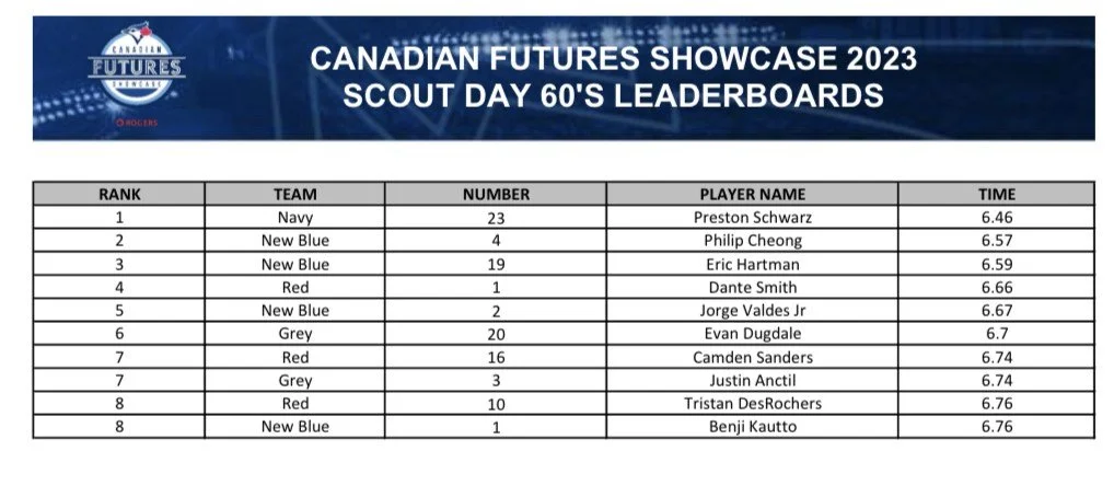 Ottawa Nepean Canadians outfielder Preston Schwarz ran the fastest 60 at the Canadian Futures Showcase at Rogers Centre on Tuesday, clocking in at 6.46 seconds.