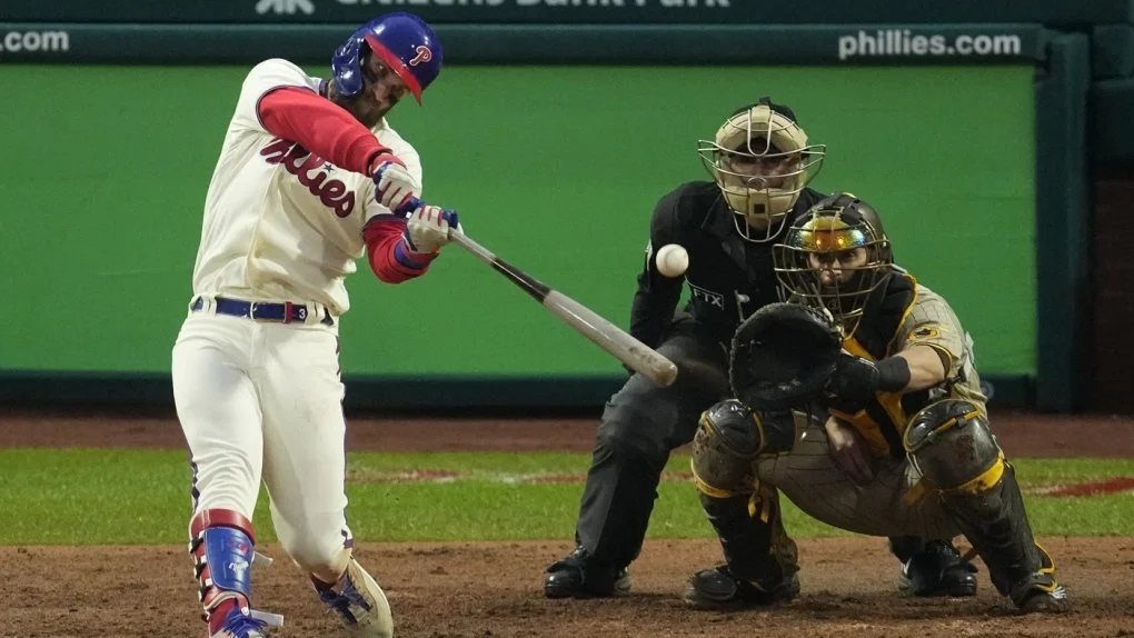 Bryce Harper’s homer — one of six he hit in 17 post-season games — lifted the Philadelphia Phillies past San Diego. Photo: Matt Rourke, AP.