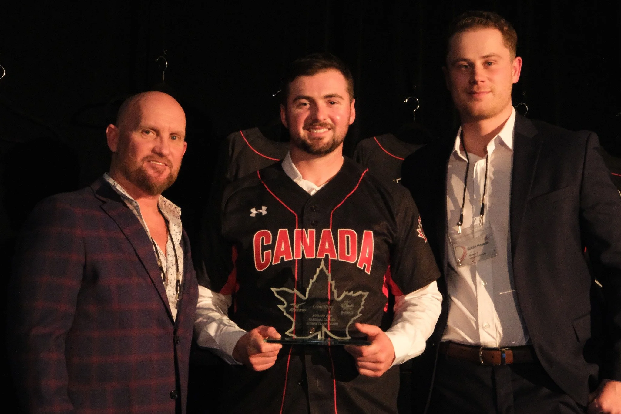 Toronto Mets alum Liam Hicks (Toronto, Ont.), middle, was presented with Baseball Canada’s Stubby Clapp Award by Stubby Clapp (Windsor, Ont.), left, at the Baseball Canada Awards banquet on January 10. Photo: Eugenio Matos, Baseball Canada