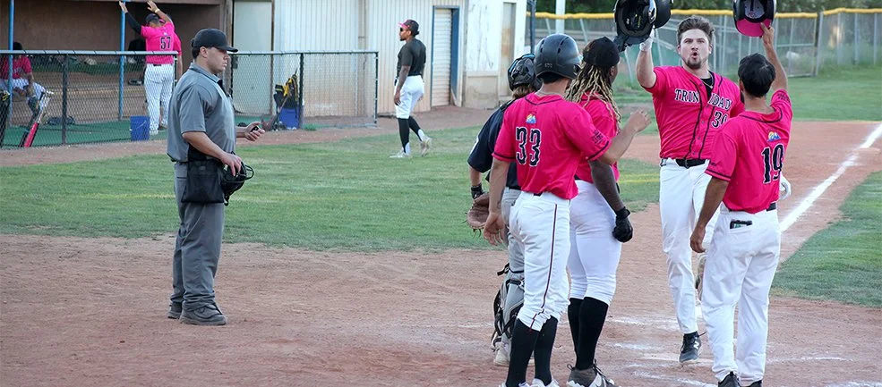 Jason Rooks celebrates with his Pecos League Trinidad Triggers teammates.