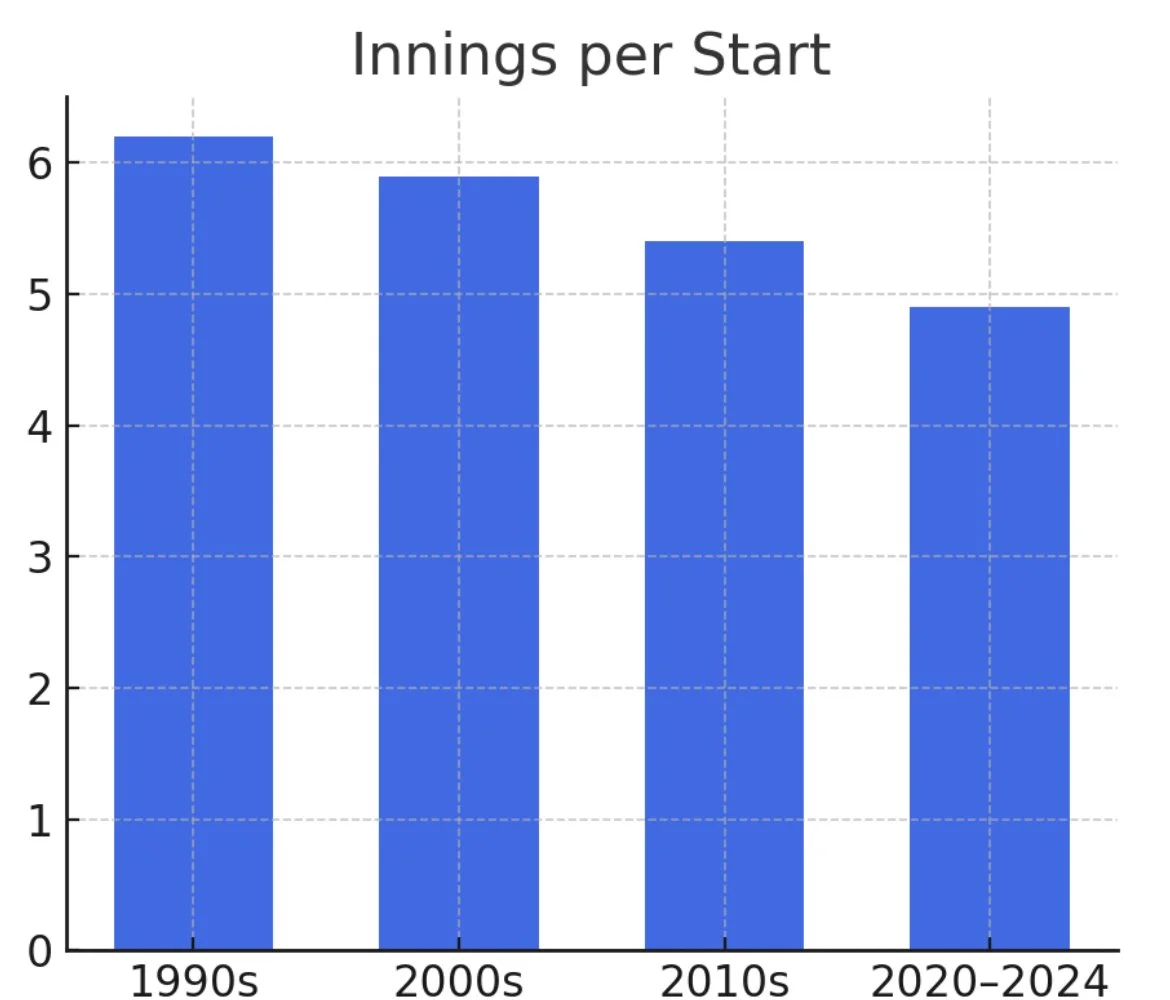 Another revealing metric is how long starting pitchers stay in the game, which reflects strategic shifts in how teams deploy their staff. Managers used to ride their horses deep into games; complete games were a badge of honor, and a starter going 7+ innings was commonplace. Now, teams pull starters earlier to optimize matchups and keep arms fresh (or to get flame-throwing relievers in sooner). The average innings per start has steadily decreased, removing another situational decision point – the question of when to yank a starter.