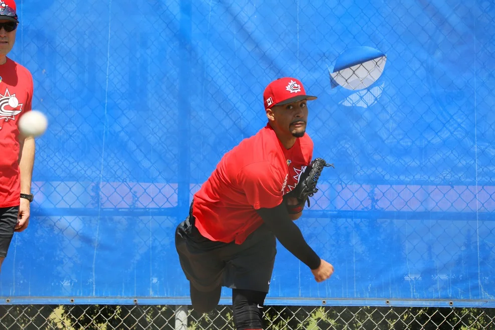 RP Jesen Therrien (Montreal, Que.) drafted by Phillies scout Alex Agostino (Montreal, Que.) throwing a bullpen during Team Canada workouts in Dunedin. He is 2-1 with a 1.26 ERa and seven saves with the double A Reading Fightin` Phils. Photo: Amanda Fewer.