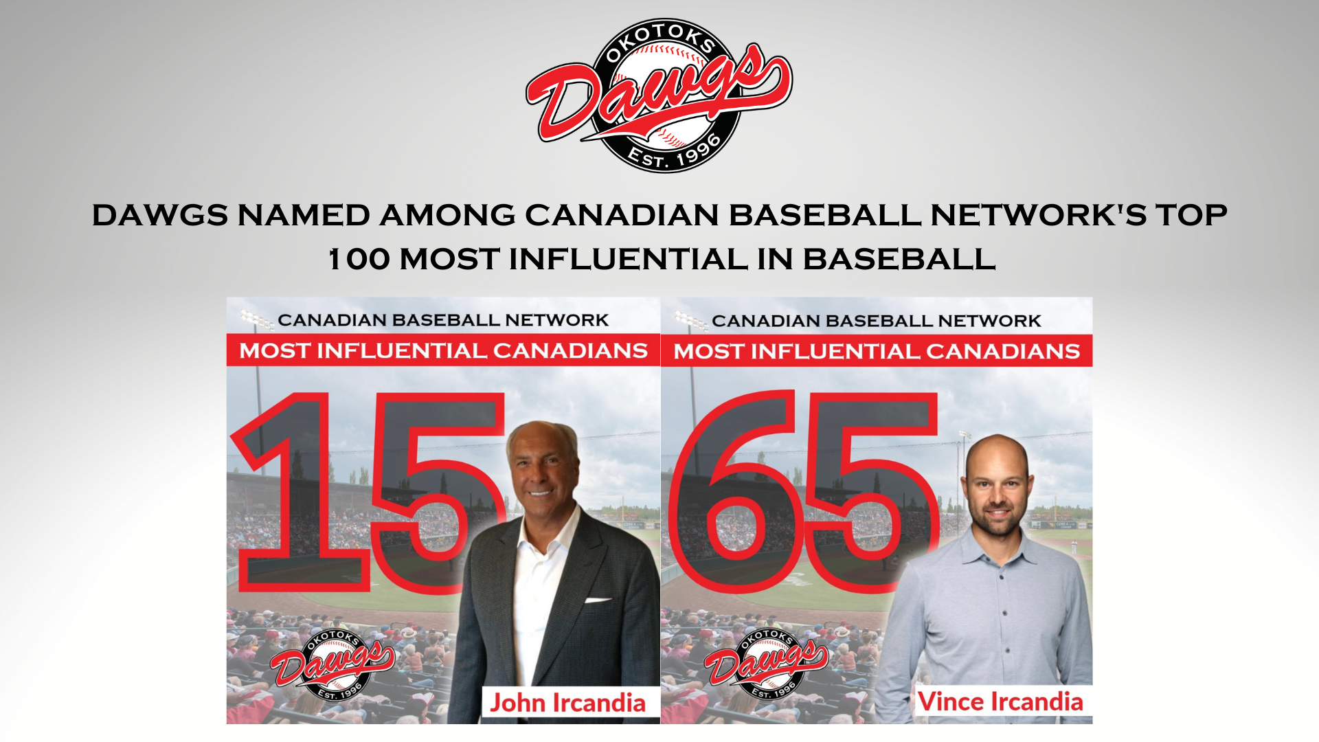 The Okotoks Dawgs Baseball Club and the Dawgs Baseball Academy (the “Dawgs”) are proud to announce that founding and managing director, John Ircandia, has been ranked as the 15th Most Influential Canadian in Baseball by the Canadian Baseball Network (“CBN”).