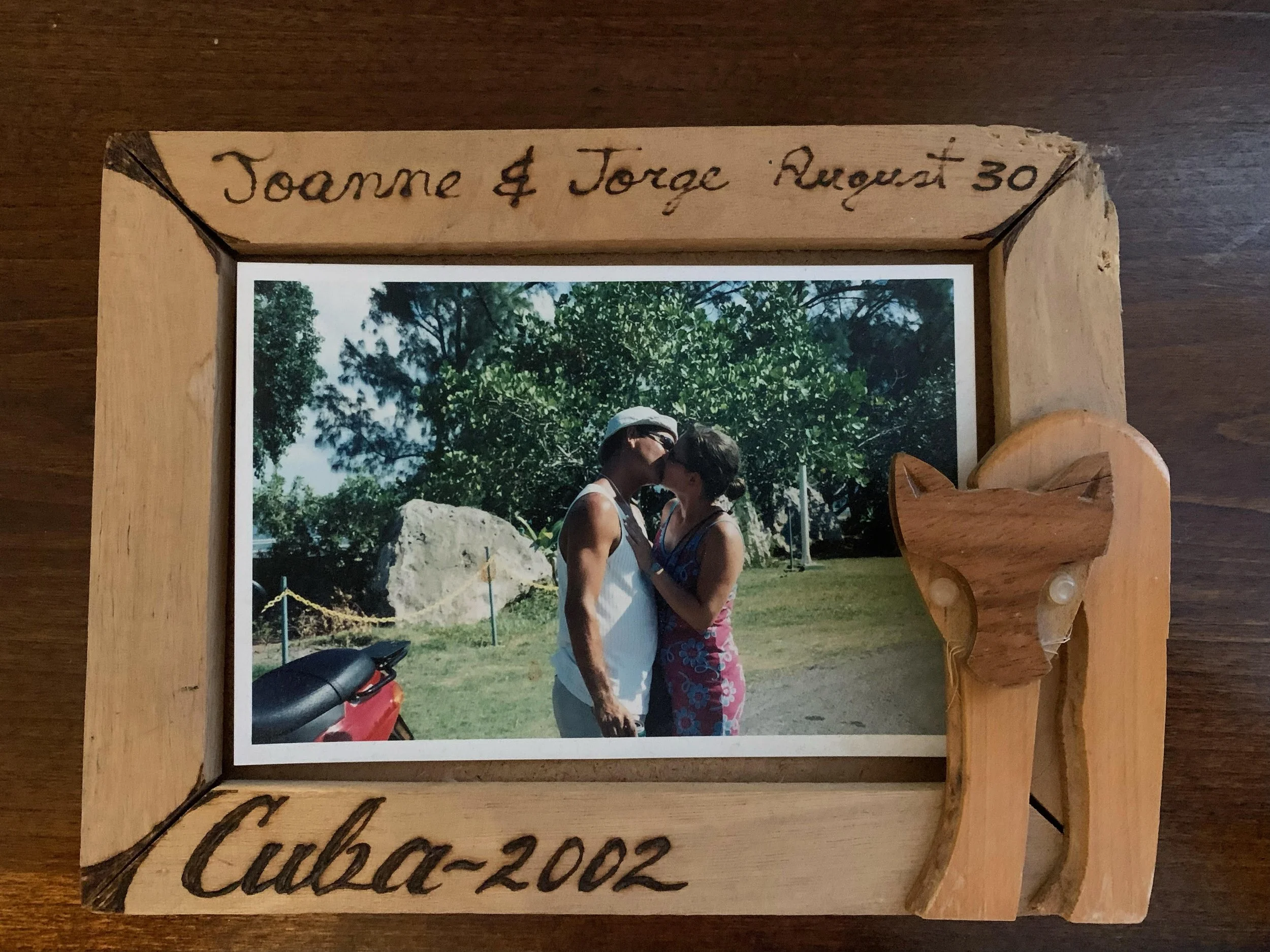 Jorge mentions the framed picture of mom and dad kissing on the island Cuba and their wedding date.