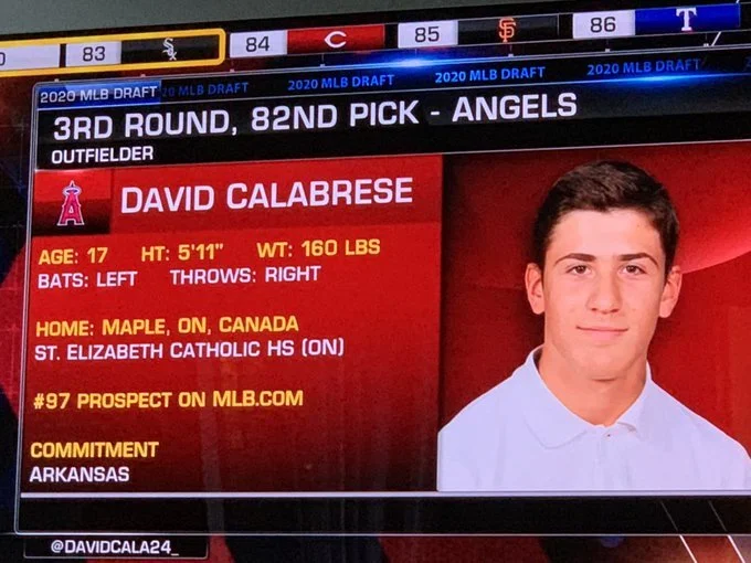 Calabrese was the third Canadian selected in the COVID-19 shortened five-round 2020 draft. He went to the Angels in the third round and was given a $744,200 US signing bonus. It was the first time the Angels have given a Canadian a six-figure bonus since Canadians high schoolers became eligible for the draft in 1991.