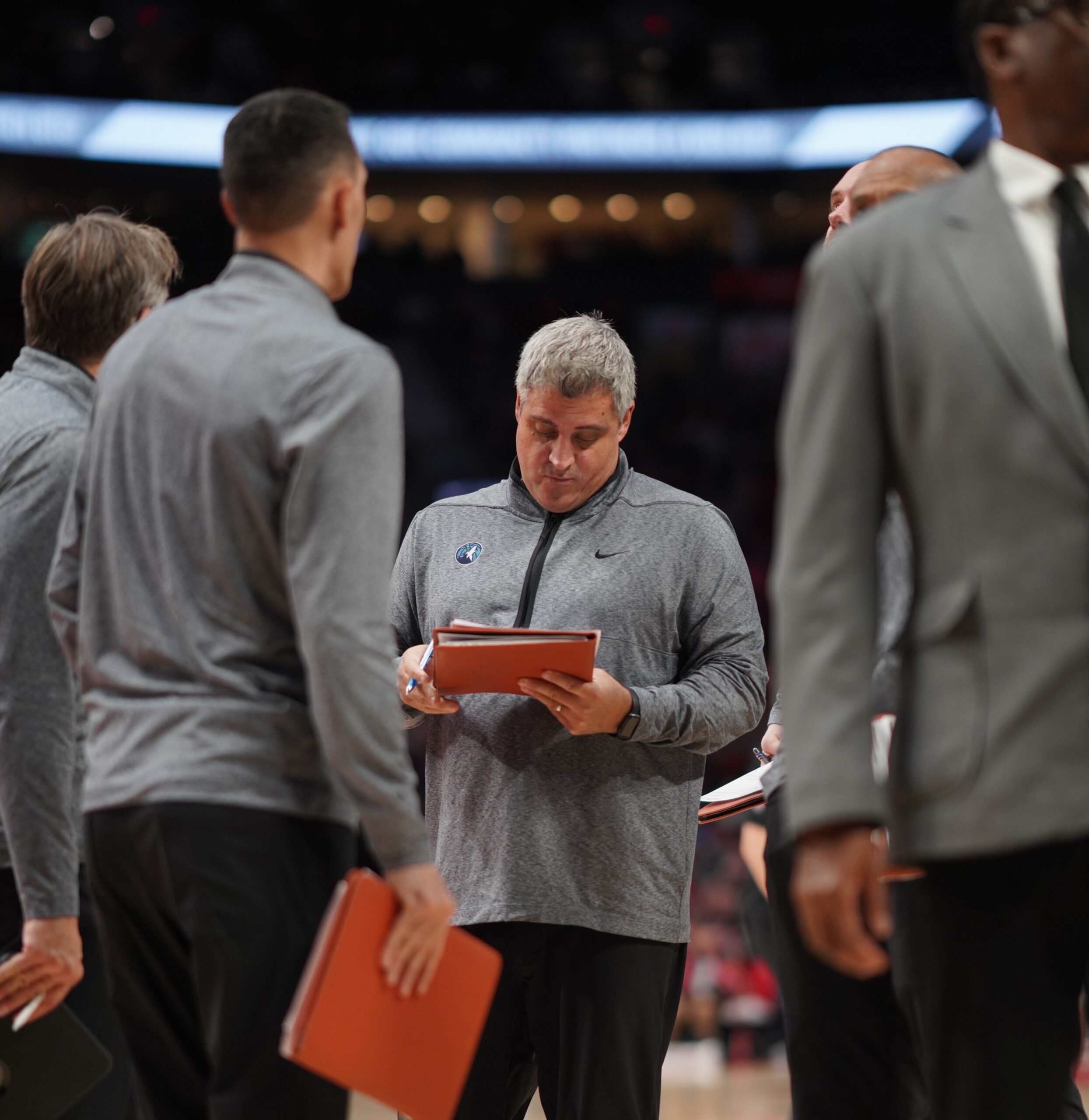 Coach Micah Nori on the sidelines of a Minnesota Timberwolves game.