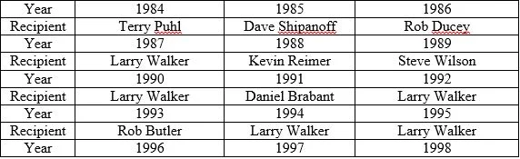 Perhaps some consideration should be given to calling it the Larry Walker Award in that he has won it a record nine times. Indeed Walker was not named the winner following his 1999 campaign in which he batted .379 with 37 home runs and 115 RBI. Jeff Zimmerman was the Tip O’Neill Award winner in his rookie season of 1999 in which he posted a 9-3 won-loss record to go along with an ERA of 2.36 in 65 pitching appearances.