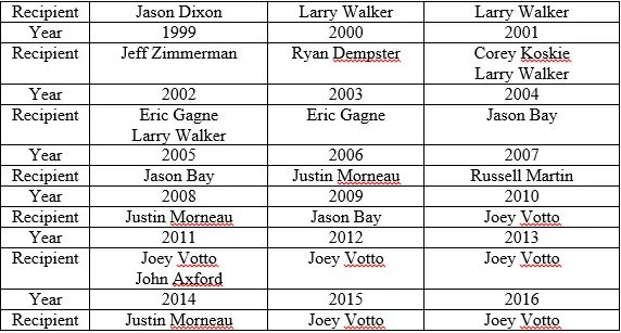 Joey Votto, last year’s award winner, now has six Tip O’Neill crowns on his trophy shelf with the possibility of garnering several more in that he still has many productive seasons in his future. Justin Morneau ranks third having captured three Tip O’Neill Awards.