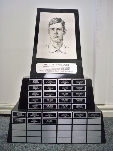 The Tip O’Neill Award is named after Woodstock, Ontario native James “Tip” O’Neill, who was one of Major League Baseball’s first legitimate stars. With the St. Louis Browns in 1887, O’Neill set single season records in hits, doubles, slugging percentage and total bases, while recording an astounding .492 batting average. Walks were counted as hits in 1887, but if O’Neill’s average was calculated by today’s standards, it would be .435, the second highest in big league history to Hugh Duffy (.438). The award is presented annually by the Canadian Baseball Hall of Fame to the player judged to have excelled in individual achievement and team contribution while adhering to baseball’s highest ideals.
