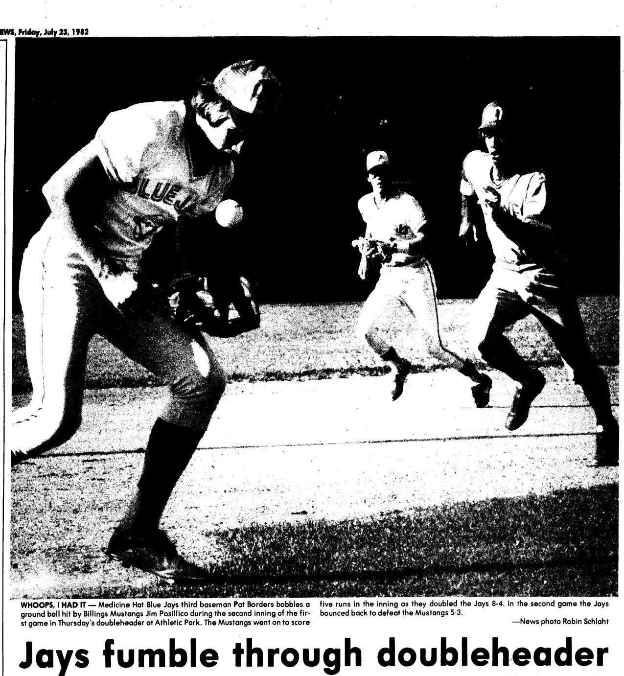 Pat Borders led the Medicine Hat Blue Jays in errors as a third baseman with the team in 1982. This clipping from the July 23rd edition of the Medicine Hat News captures one of his fielding mistakes.