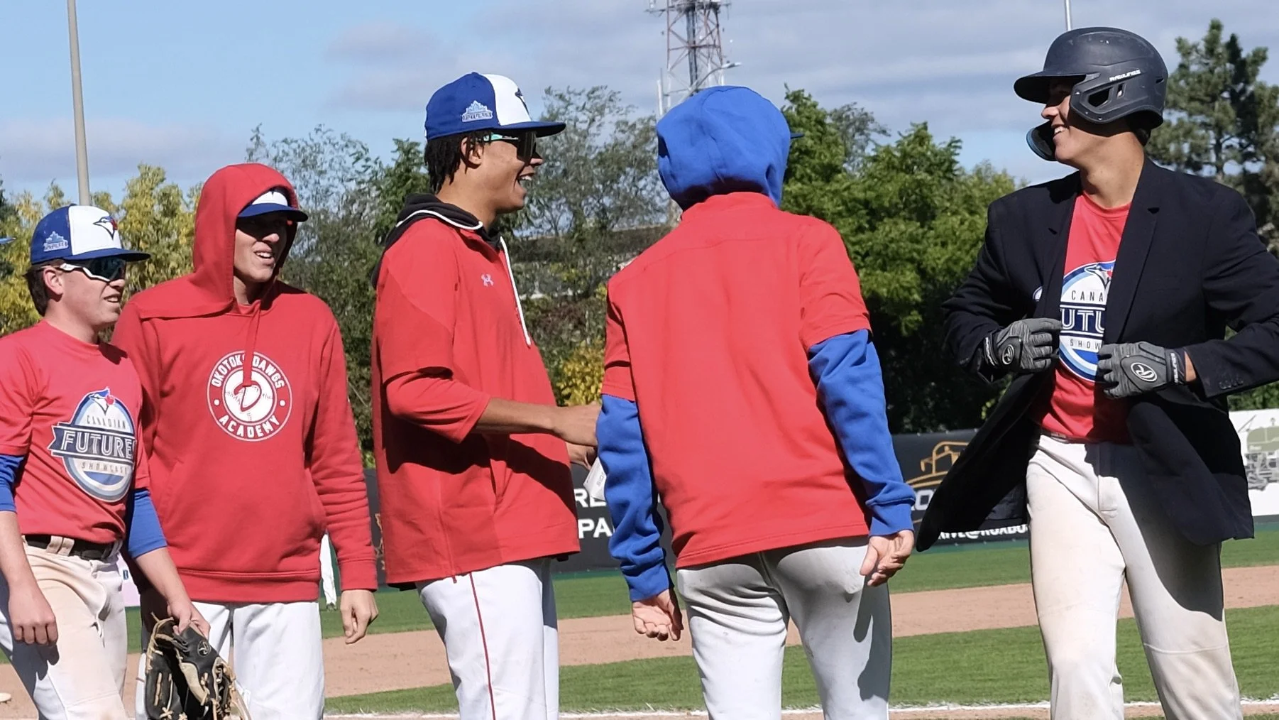 Ontario Terriers and Team Red catcher Jason Green Georgetown, Ont.), shown on the far right, celebrates with teammates after hitting a homer at the bottom of the sixth inning in Friday’s second game of the Canadian Futures Showcase. Photo: Ella Milloy