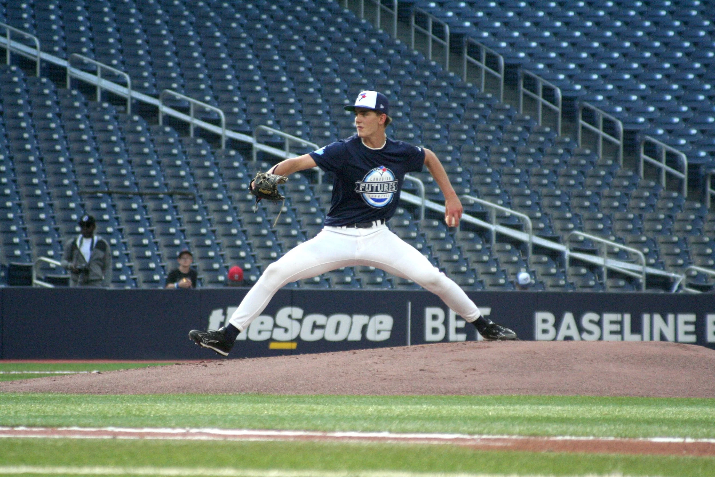 Team Navy starting pitcher Josh Mills (Leduc, Alta.), of the Okotoks Dawgs Academy, delivers a pitch against Team Grey at the 2025 Canadian Future Showcase on Thursday at Rogers Centre in Toronto. Photo: Faraz Hashmi
