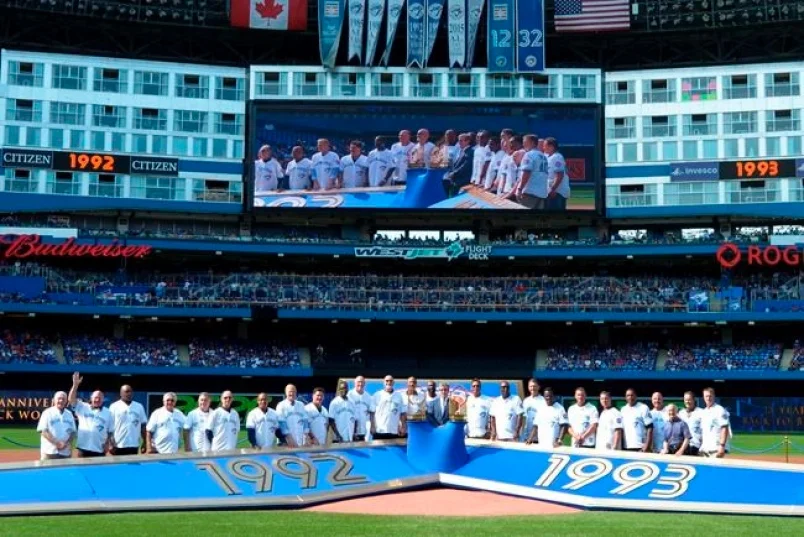 The Toronto Blue Jays hosted some members of the 1992-93 World Series champions on Saturday at the Rogers Centre. Hall of Famers Robbie Alomar and Dave Winfield were on hand. New Hall of Fame inductee Jack Morris and HOFer Paul Molitor were missing but videos were played. Morris was having his No. 47 retired at Comerica Park, and Molitor was managing his Minnesota Twins against the Tigers.
