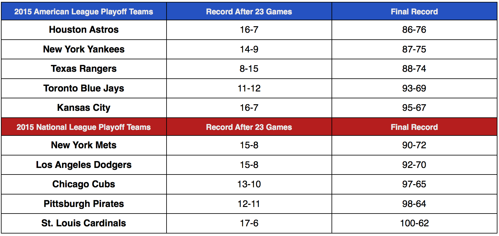 Only two teams had records below .500 at this point - the Texas Rangers (8-15) and, yes, the Toronto Blue Jays. Coincidentally, both of those teams made major moves near the Trade Deadline (but then again what playoff team doesn’t?).